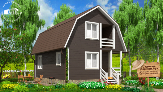 «Светлячок» - проект каркасного дома 6 на 8 с мансардой и балконом. На первом этаже есть открытая веранда, небольшая прихожая, санузел, кухня-гостиная и рабочий кабинет. На втором этаже - комната отдыха, спальня и балкон. У дома ломаная кровля. Если заменить ее на обычную двускатную, то стоимость снизится на 120.000 рублей.