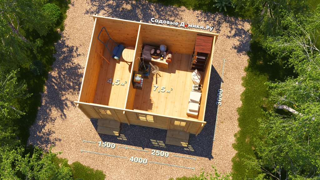 Этот проект похож на «Пчелку», отличие в том, что здесь 2 помещения, а не 3. Соответственно, площадь этих комнат несколько больше и Вы сможете комфортнее устроиться. Под рабочий кабинет сделан отдельный вход. Так Вы не будете таскать грязь в жилую зону. Очень удобно!
