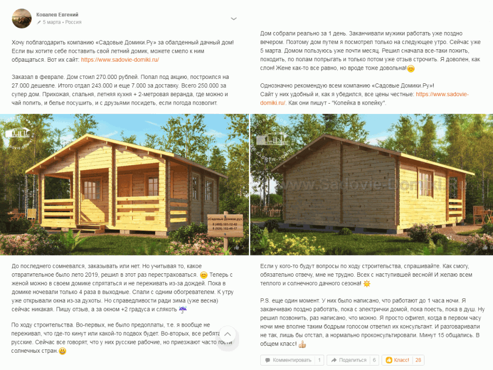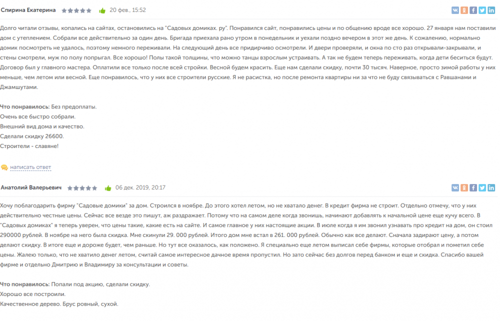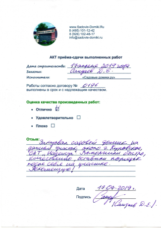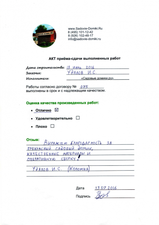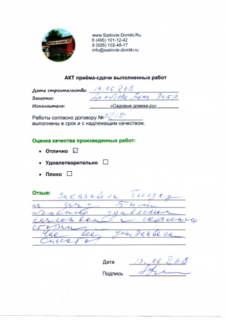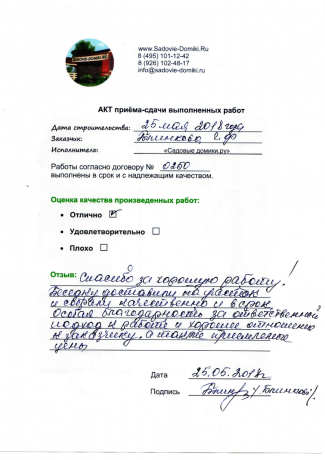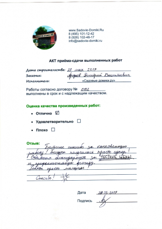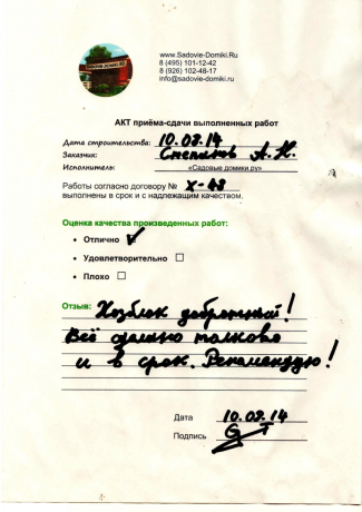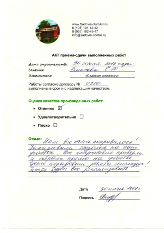 В этом разделе мы будем публиковать рукописные отзывы и видеоотзывы о работе компании «Садовые Домики.Ру».